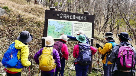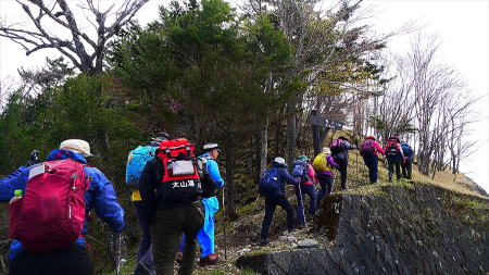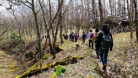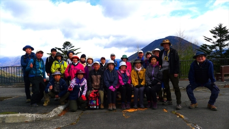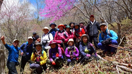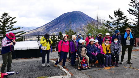 登山支度後男体山をバックに集合写真を撮り、アカヤシオの咲く登山口より登る。