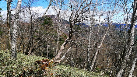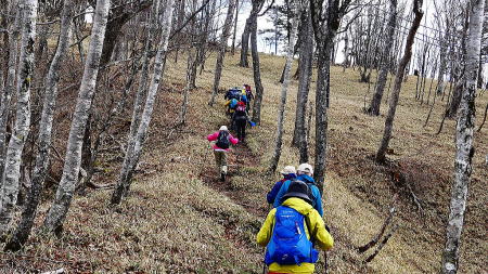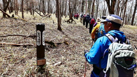 長い登りも終わり茶ノ木平で休憩。明智平方面に歩き途中、分岐を細尾峠へ長い稜線を下る。