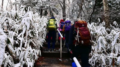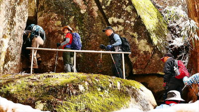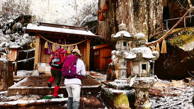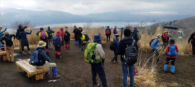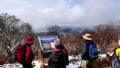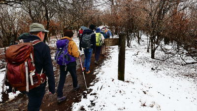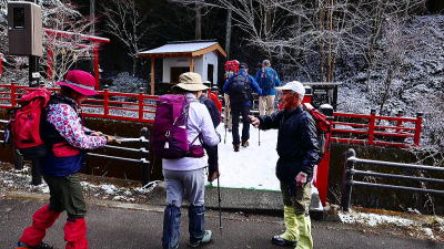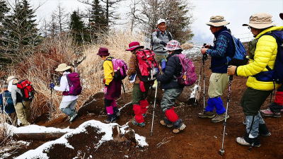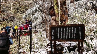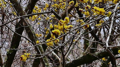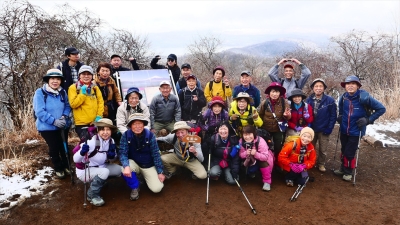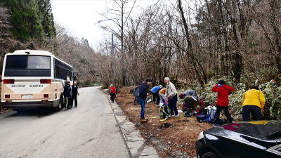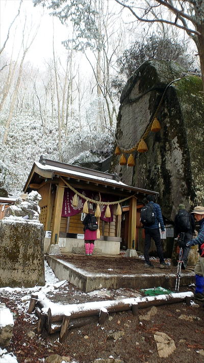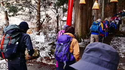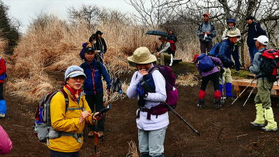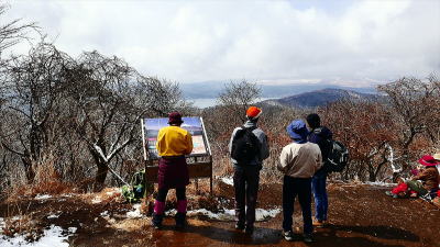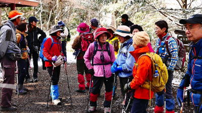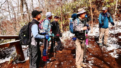 昨日太田方面は雨だったが、富士山付近は降雪で山々は雪化粧していた。山中湖湖畔を順調に走り7時40分石割登山口に着いた。登山支度をして8時10分石割神社の赤い鳥居をくぐり403段の石段を登る。途中休み休み何とか登り富士見平に到着大休止。眼下に山中湖を一望する。山頂を目指しよく整備された山道を登る。途中御神木“桂の木”を見学参拝。石割神社奥社に到着。御神体の石割の参道を左周りに回る。回った後逆回りと気づくが“後の祭り”神の御心にすがる。何とか全員が狭い割れ目をぬけ参拝を済ませ山頂を目指し登る。山頂近くは急登できつかったが9時10分石割山頂に到着、まだ早いが30分の休憩を取り昼食にした。富士山は雲が厚く垂れ込み見ることは出来なかった。山頂で案内板の富士山をバックに記念写真を撮り次の山、平尾山へスタート。途中富士山が見られることを期待して下る。雪解けでぬかるんだ泥道は滑りやすく休み休み慎重に下り、鞍部に下りると歩き易くなる。分岐を過ぎ平尾山に11時到着、長い休憩を取った。雲は重く垂れ込め富士山を見ることができず下山。来た道を少し戻り広く平坦な道を歩く。しばらく歩くと急な階段となり慎重に下る。途中石割山登山口分岐付近にサンシュウの花が咲き心が癒された。谷へ九十九折の急坂を下り沢に出る。砂防ダムの上を渡渉して林道に出る。バスの待つ石割登山口に着12時05分到着お風呂の準備をして石割の湯に移動。石和の湯に浸かり疲れを癒し14時帰途に就いた。途中谷村PAと狭山PAに寄り休憩。太田BTに17時40分到着無事解散した。小仏トンネル手前で少し渋滞したが、あとは順調に走り早い到着、久々に温泉登山を満喫することができた満足でした。