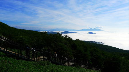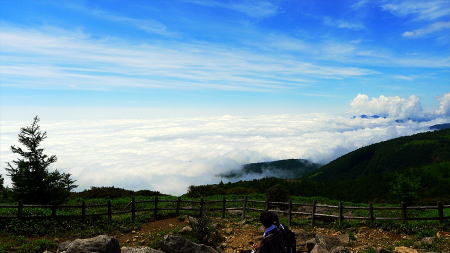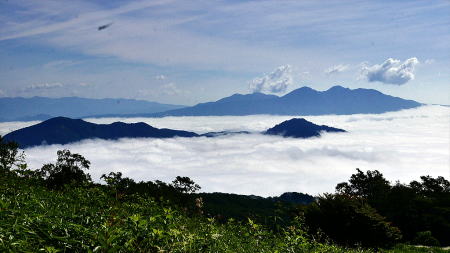 空は晴れ雲海が眼下に広がり幻想的な気分。小丸山頂で大休止後丸山へ。